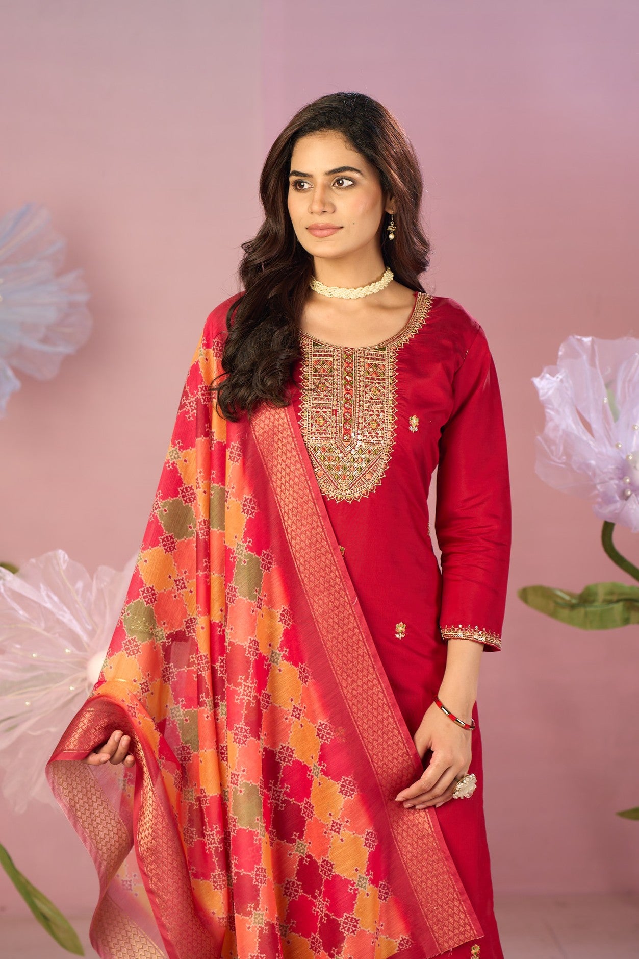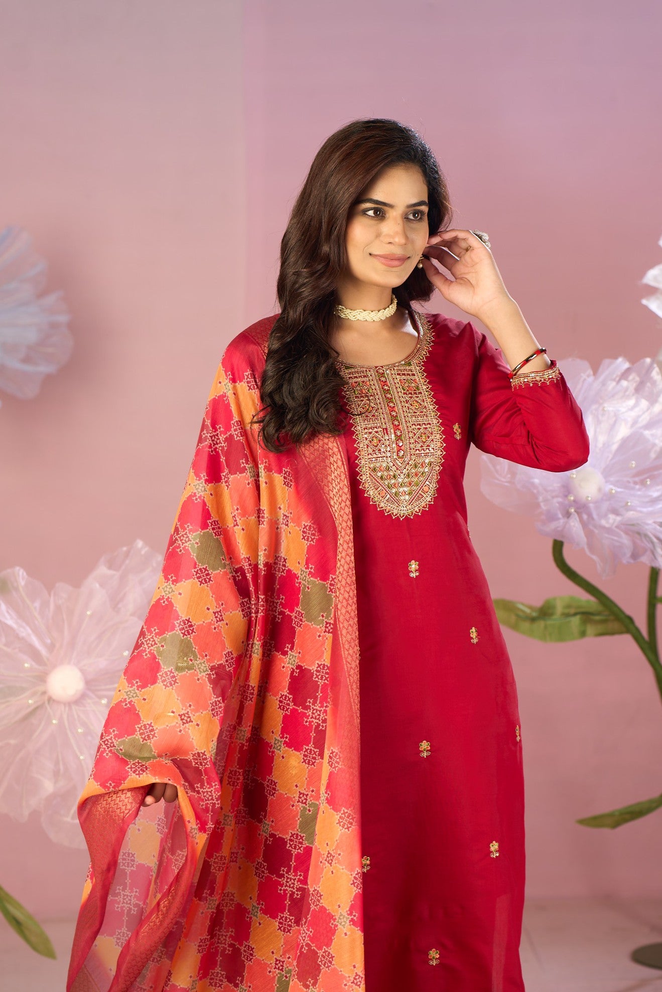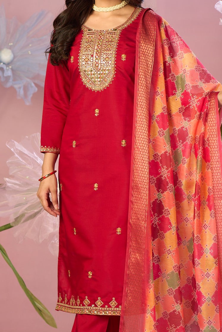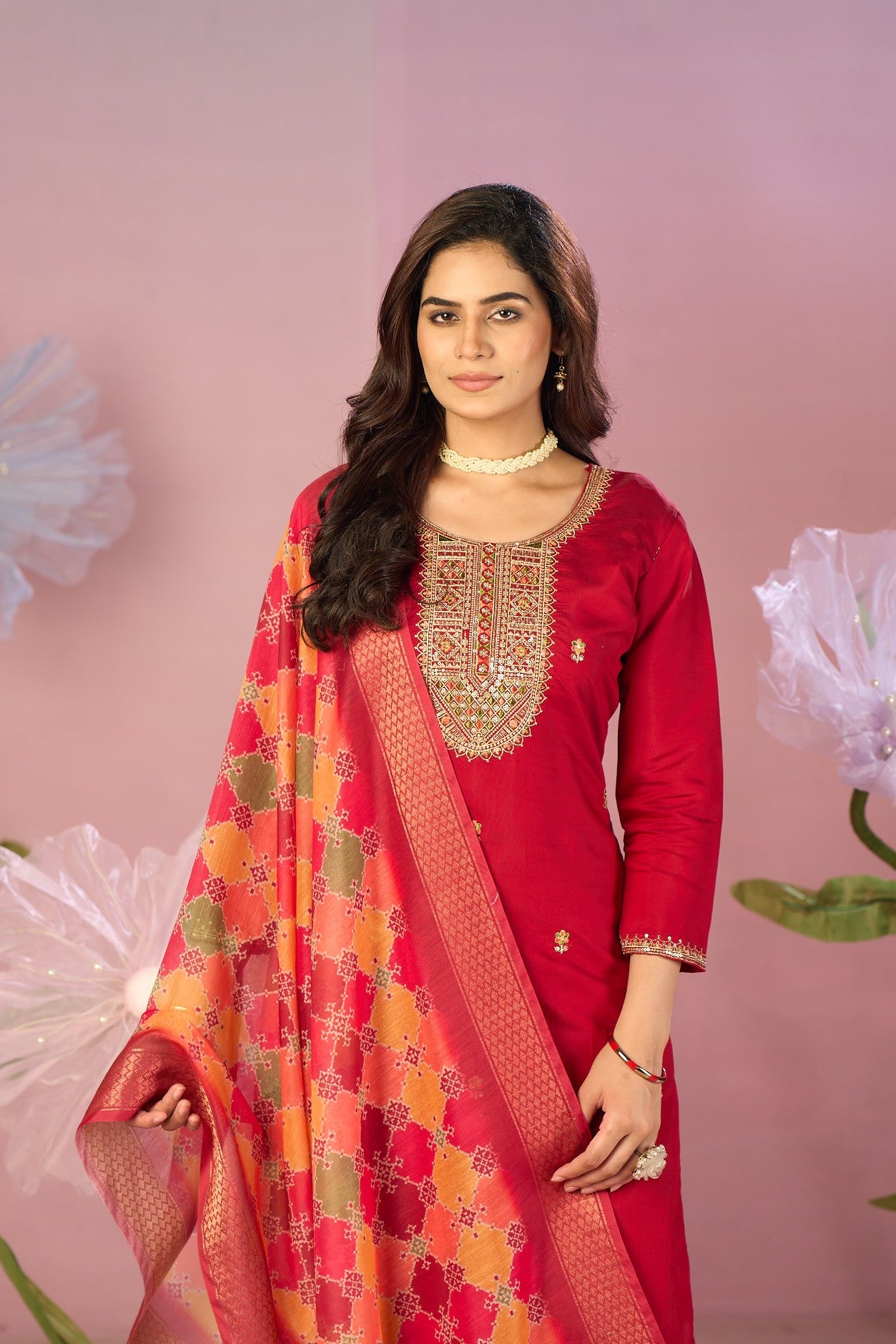 3-piece set: Crimson red straight-cut kurta, matching trousers, and richly patterned dupatta.